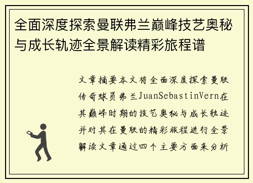 阅读本文将围绕“全面解析曼联弗兰巅峰技能与高效解锁操作技巧实用进阶指南全套篇”展开,以系统化结构梳理弗兰在曼联时期的竞技特征、技术要点、配合思路以及在实战模拟类游戏或战术训练中的进阶操作方法。文章开篇以摘...
